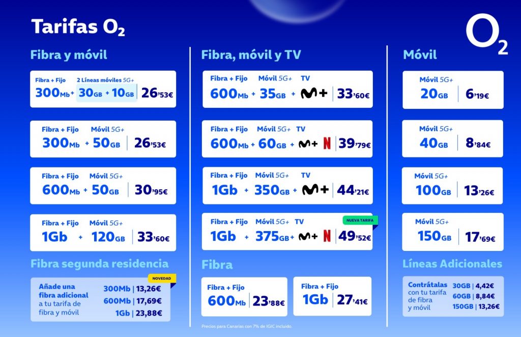 Con O₂ disfrutarás de tarifas claras y estables, sin permanencias, sin subidas inesperadas ni letra pequeña. Solo lo que necesitas: fibra óptica simétrica con hasta 1 Gbps, cobertura nacional con la red Movistar, y tarifas móviles con 5G+, llamadas ilimitadas y datos más que suficientes para navegar con libertad.